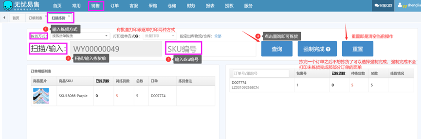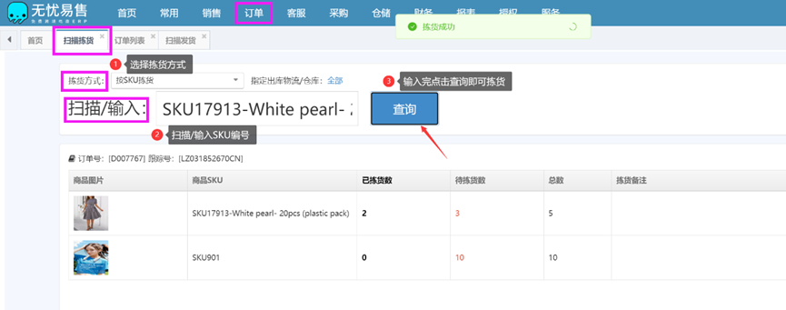 输入SKU拣货之后,扫描/输入sku编号,点击查询即可拣货。