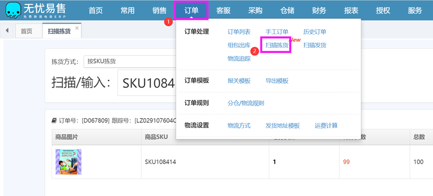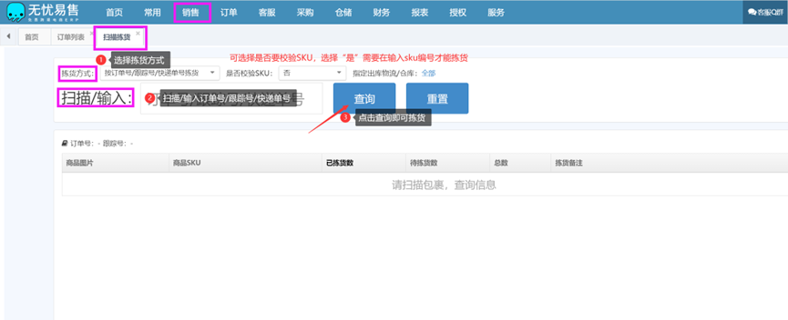 第一步:进入对应扫描拣货产品页面(路径:无忧易售ERP—订单—扫描拣货)